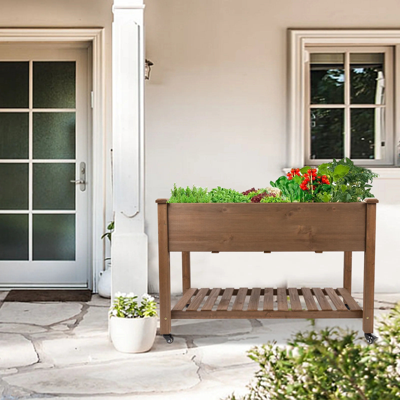 This 33-inch tall raised garden bed maximizes planting and storage space with built-in shelves. Its ergonomic design protects your back and knees, and assembly takes about 30 minutes with clear instructions. Made from durable, weather-resistant fir wood, it prevents buckling and sagging. Universal wheels with locks allow easy movement for optimal sunlight or shade.