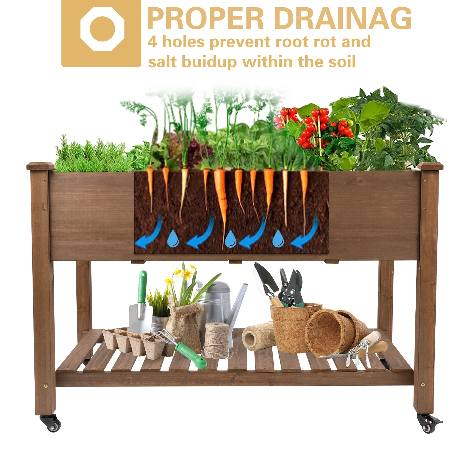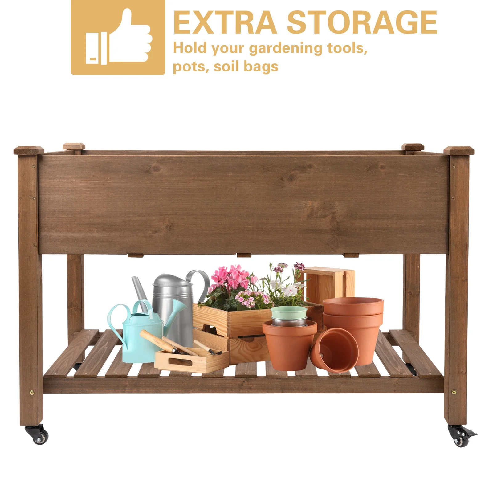 - EFFICIENT USE OF SPACE: Our raised garden bed includes practical storage shelves underneath, great for storing all your garden tools and extras. This neat design helps you make the most of your gardening area and keeps everything you need handy.