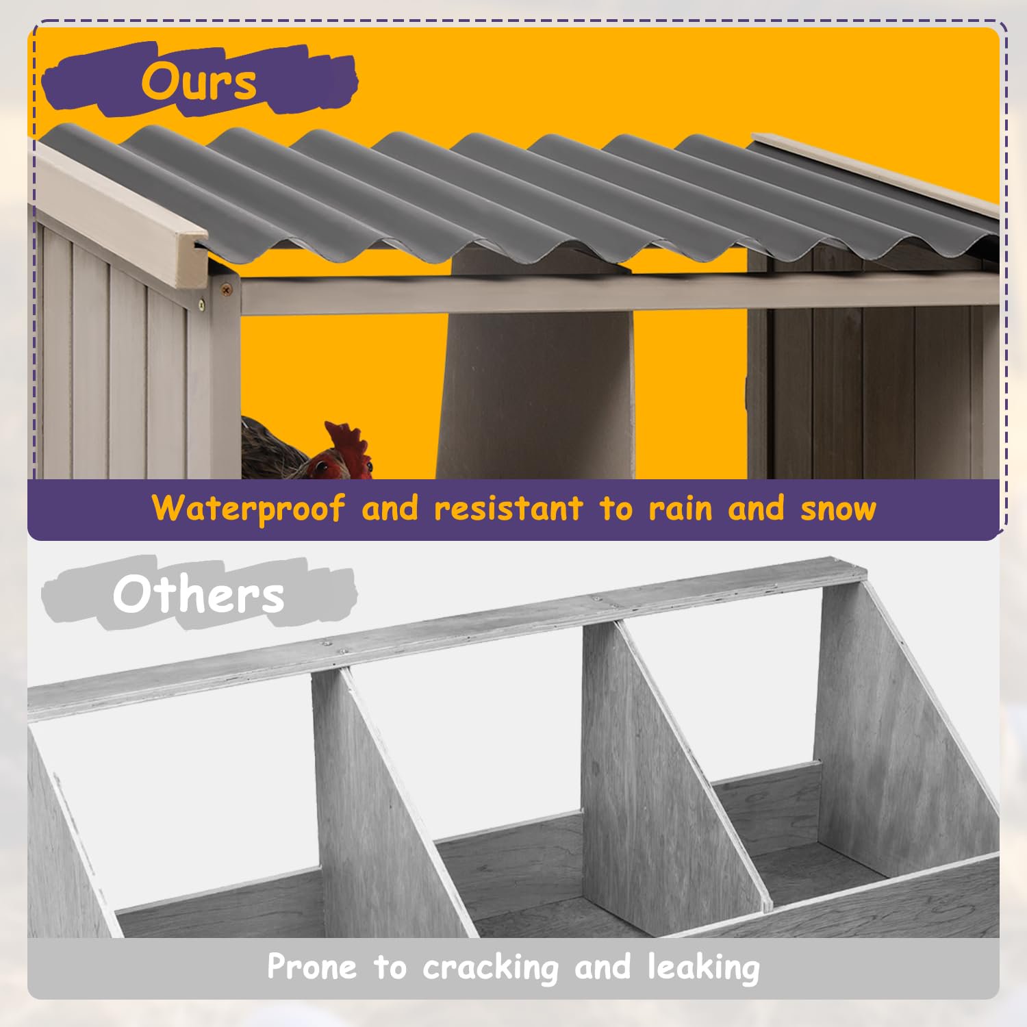 - 【 Safe & Secure Shelter】Made from sturdy fir wood with a PVC roof, this nesting box protects against rain and sun. It naturally imitates the habitat that hens like, encourages egg laying and reduces hen stress.