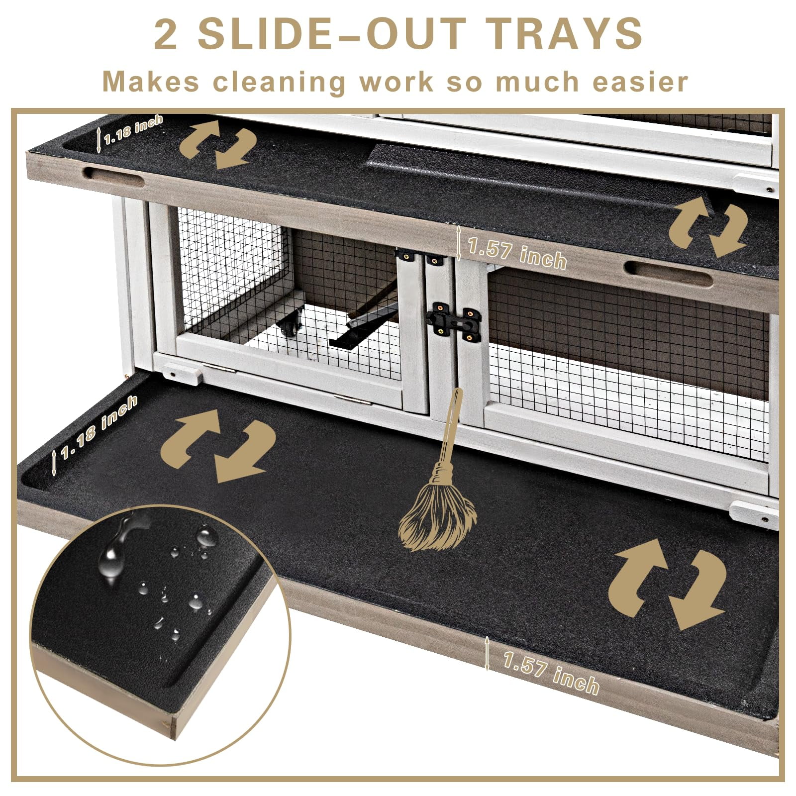 - 【2 PULL OUT TRAYS & EASY TO MOVE】Say goodbye to messy cages and hello to easy maintenance! The bunny cage is equipped with two deep no-leak trays that simplify cleaning, ensuring a clean and healthy living environment for your pets. Featuring four lockable metal wheels, this rabbit cage is easy to move, allowing you to provide your pets with a change of scenery indoors and outdoors. Whether you want to bring them closer to you or let them enjoy fresh air and sunshine, this cage offers the flexibility you need.