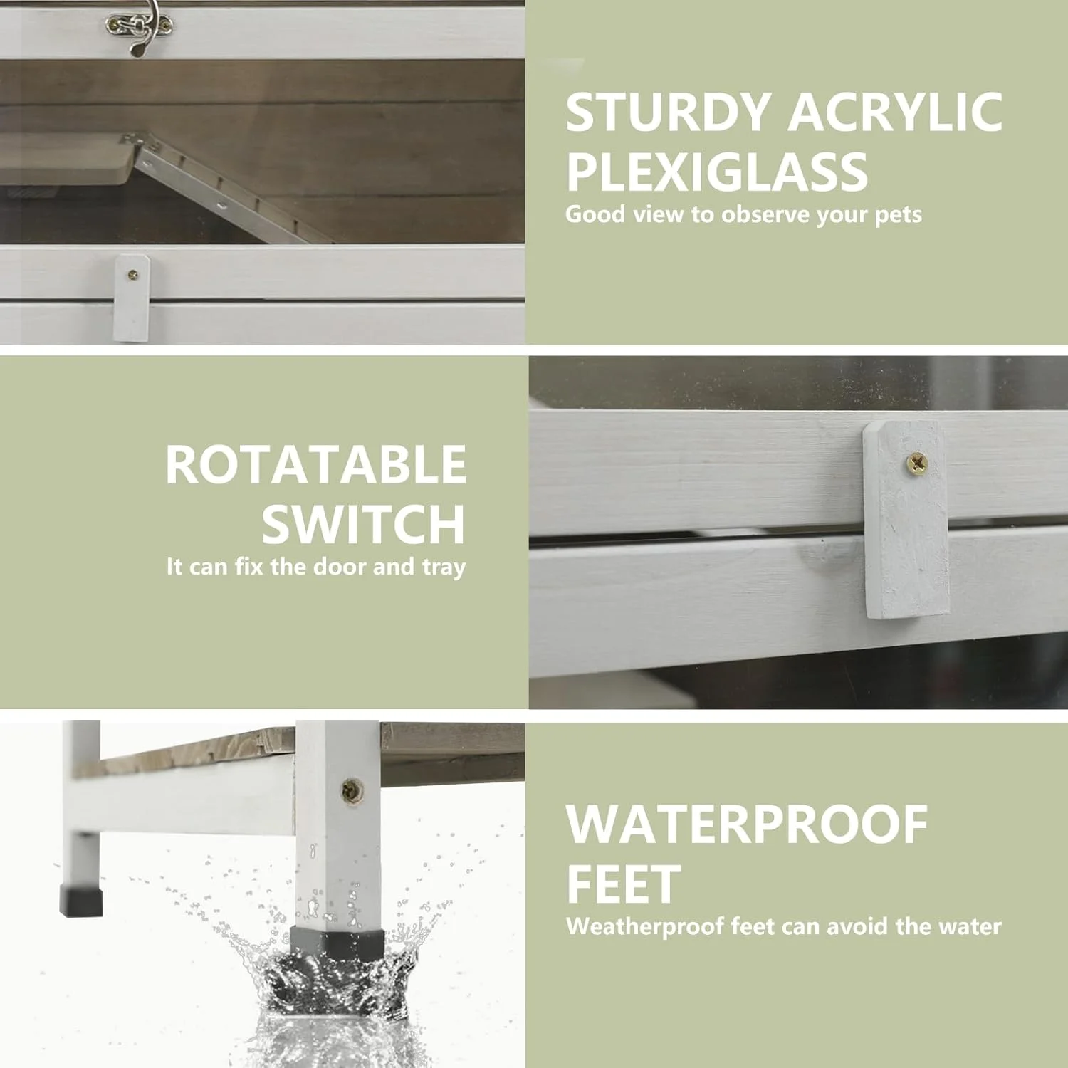 - High-quality Cage: The guinea pig cages made of 100% natural fir wood is sturdy and durable. The spacious bottom shelf is used to keep pet supplies, providing convenience to use them at any time. Rubber pads added to the 4 legs can protect your floor. Deepth with 1.38″ of pull out tray is not easy to leak,the feature of easy to clean can protect your indoor environment. Simple style of the animal cage can suit for any indoor decoration style.